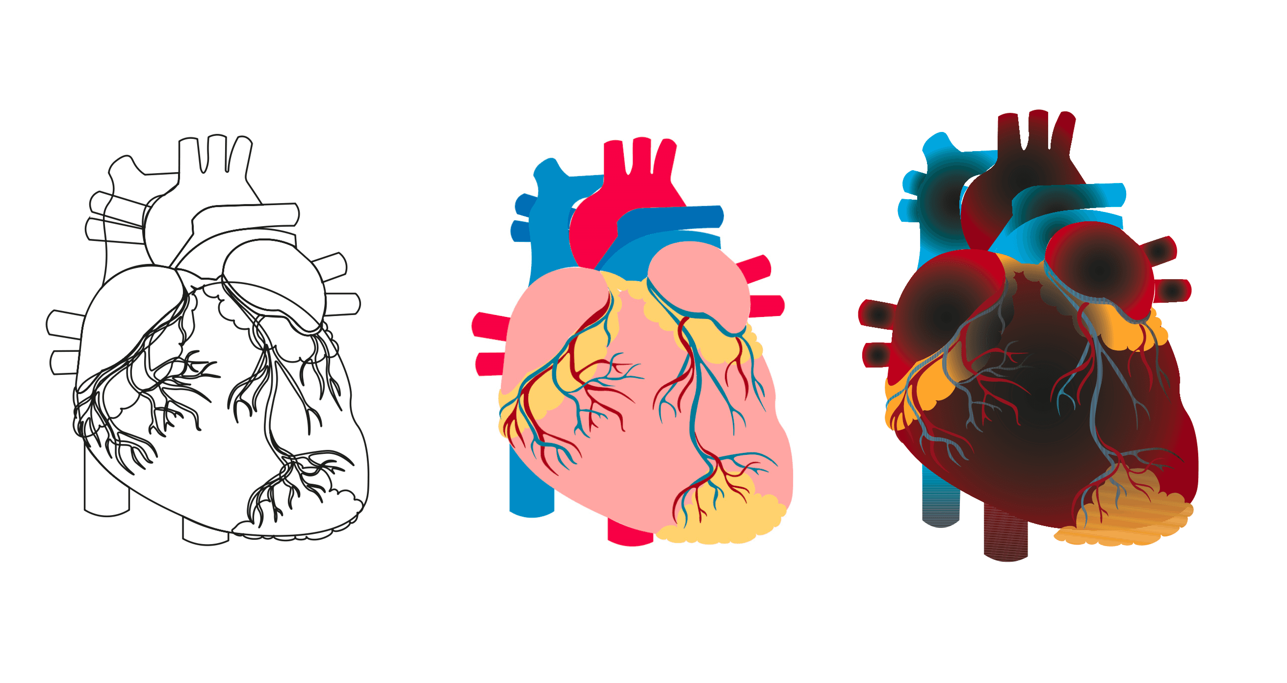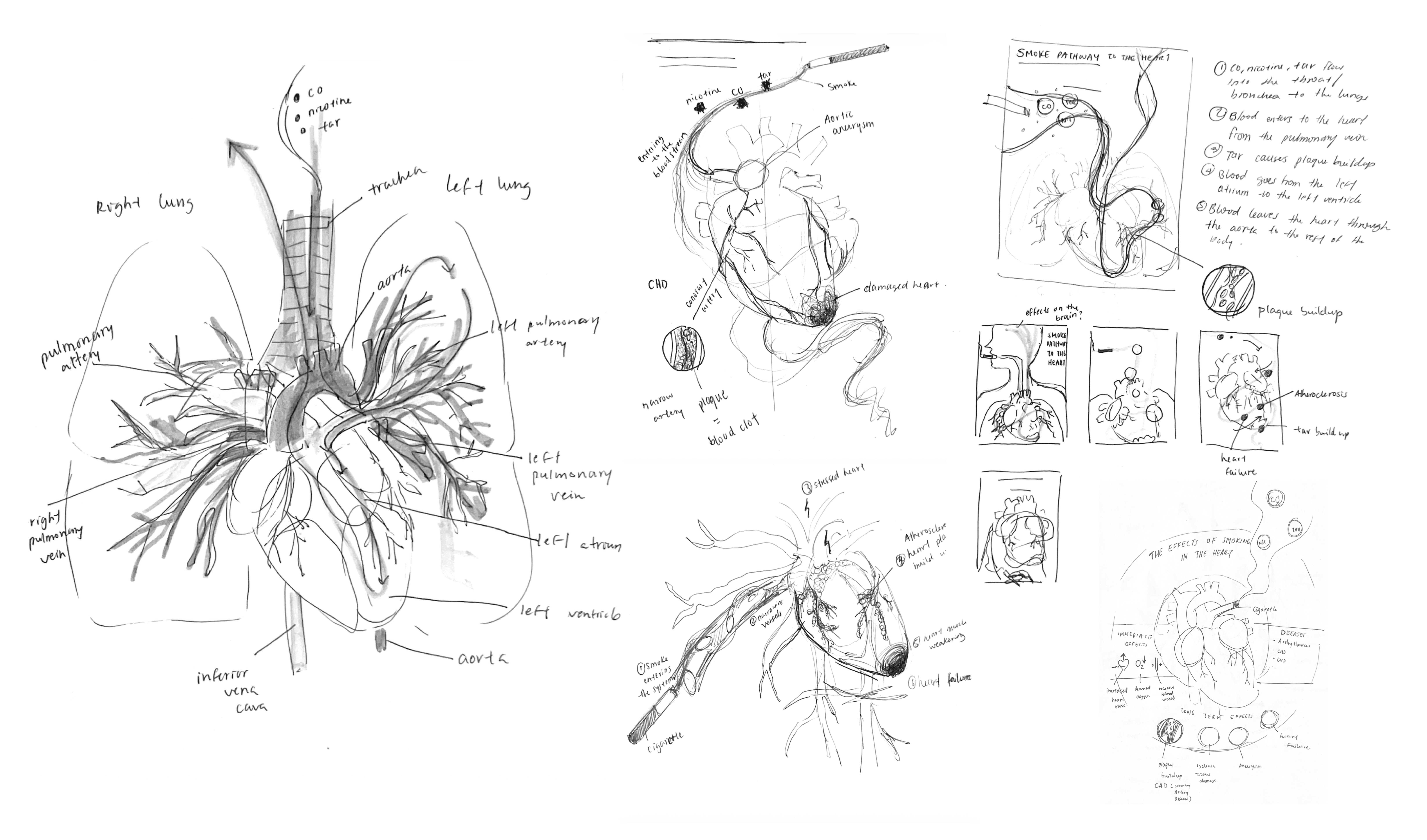 Here are some of the initial sketches I did to get a general idea of how to visualize the effects of smoking on the heart before moving on digitally. I explored different layouts and structure to potentially experiment later on.