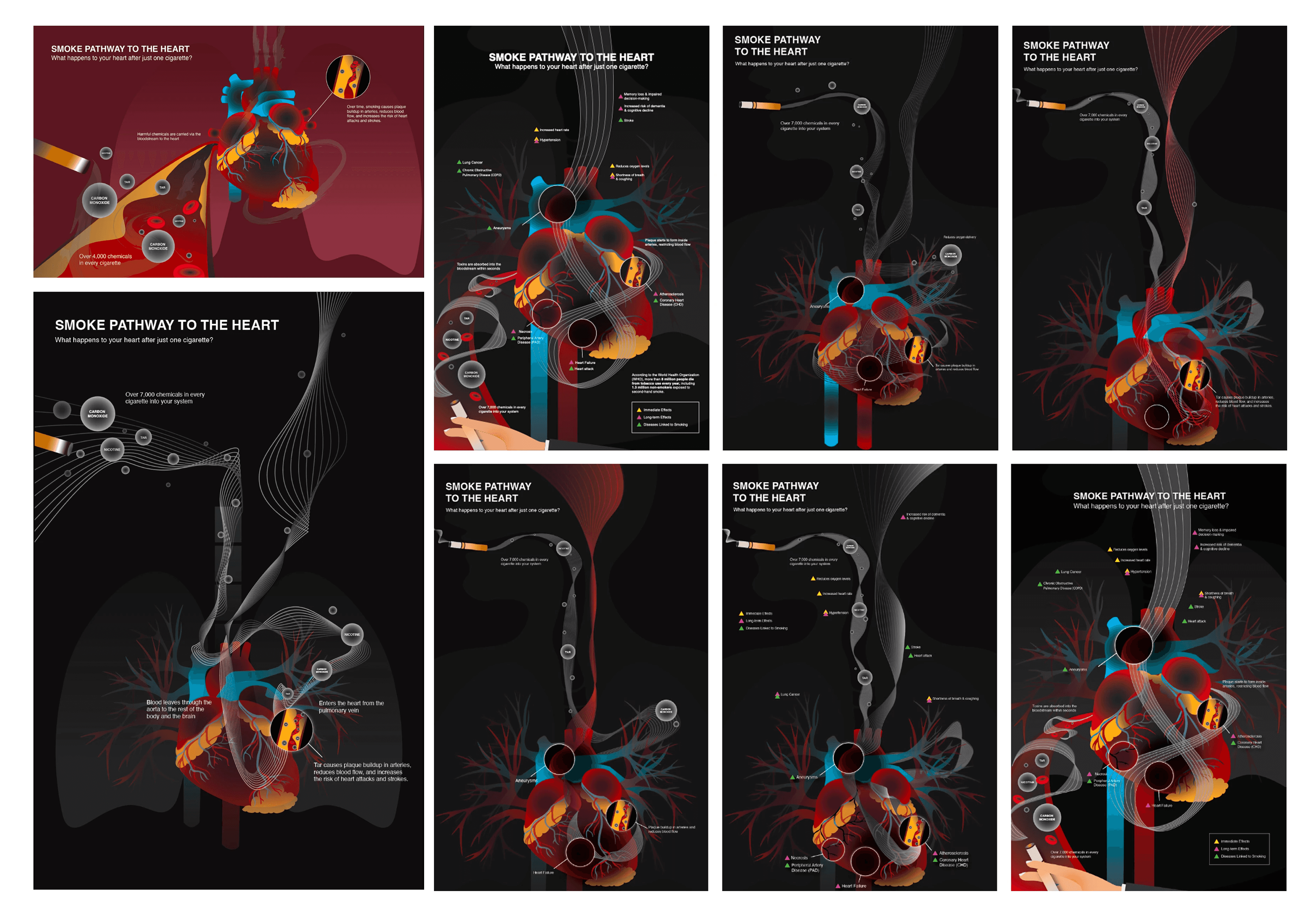 By tracing the "smoke pathway" from the initial inhalation to systemic organ damage, the project transforms complex physiological data into a clear, step-by-step visual story. The design focuses specifically on the heart, illustrating how localized habits lead to devastating, long-term cardiovascular consequences.