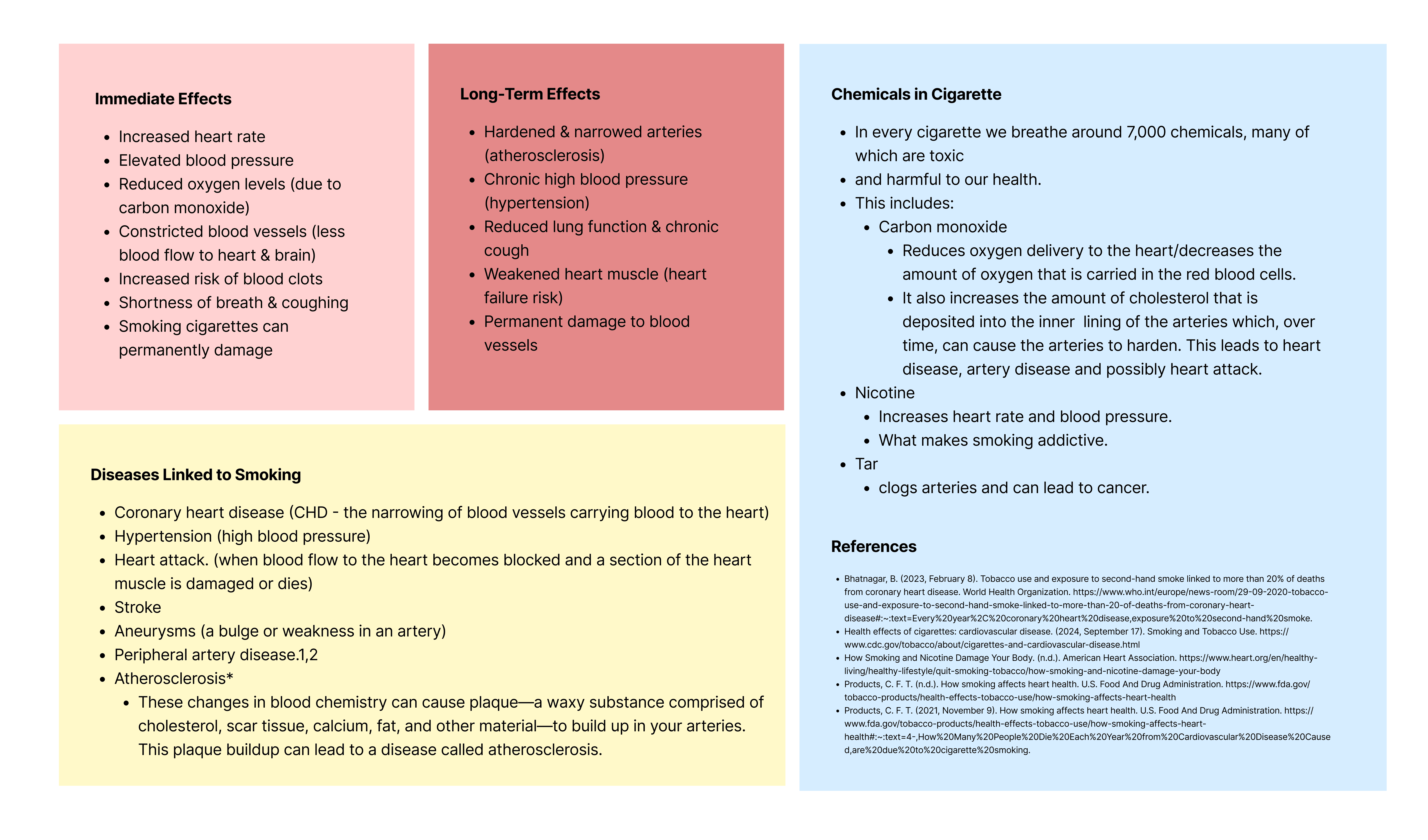 The final design is an infographic that visually communicates both the immediate and long-term effects of smoking on the heart, emphasizing the severity and progression of its consequences.